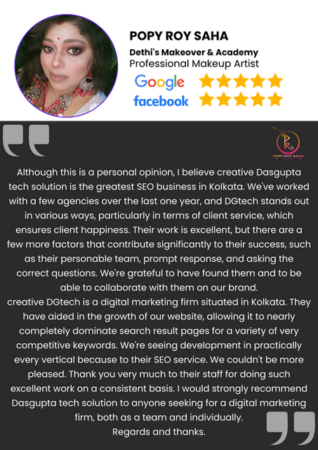 At DASGUPTA TECH SOLUTION, we are dedicated to providing our clients with an unmatched service. Our team of digital marketing and website design experts work tirelessly to deliver a top-quality product each and every time. Our customers have left us glowing feedback, praising us for our attention to detail, smooth communication, and excellent work ethic. We always put our customers first, and it shows in our client’s satisfaction.